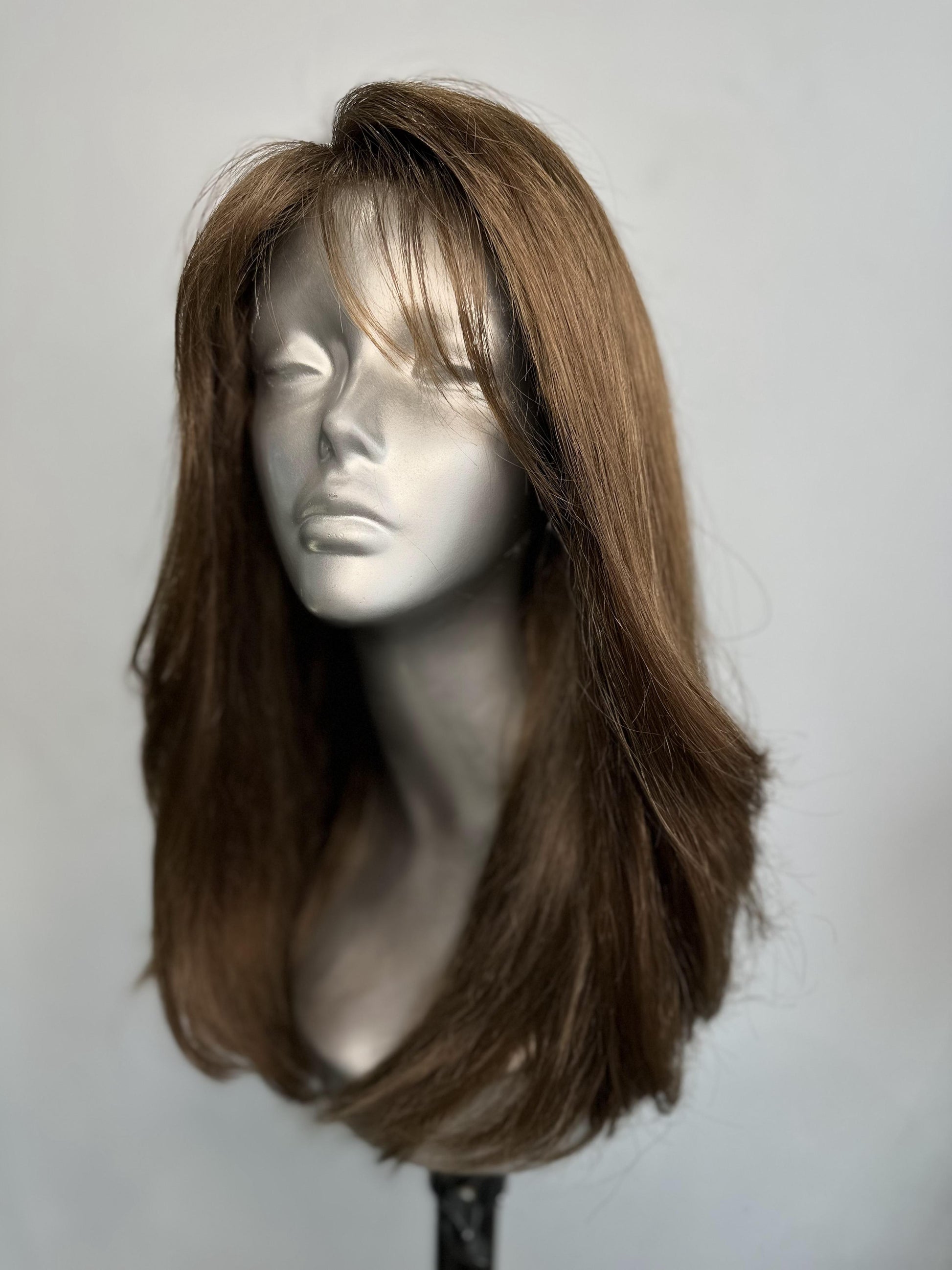 "Velvet Chestnut Brown" 20-Inch Brown Layered Human Hair Wig with Silk Base Front Lace