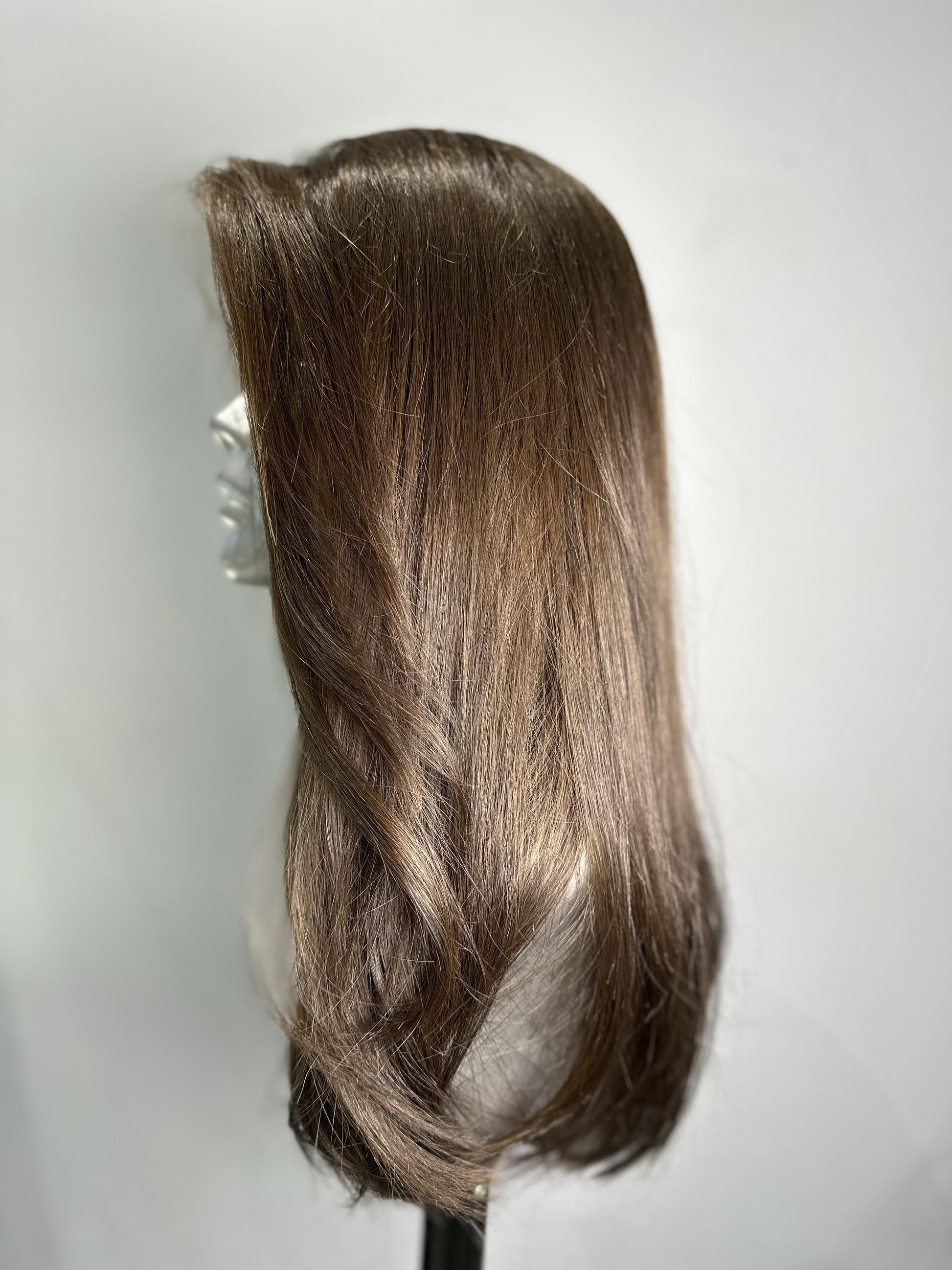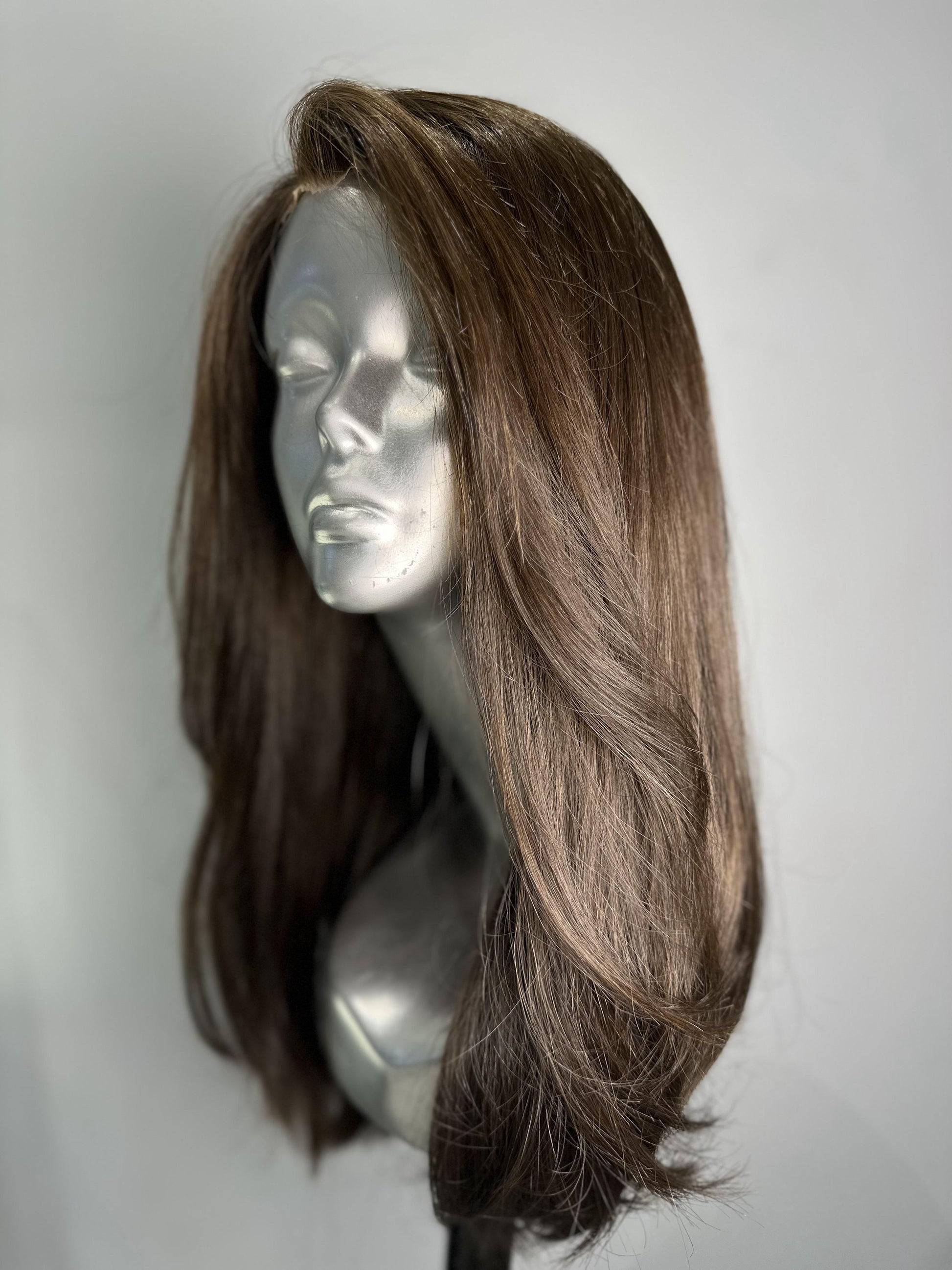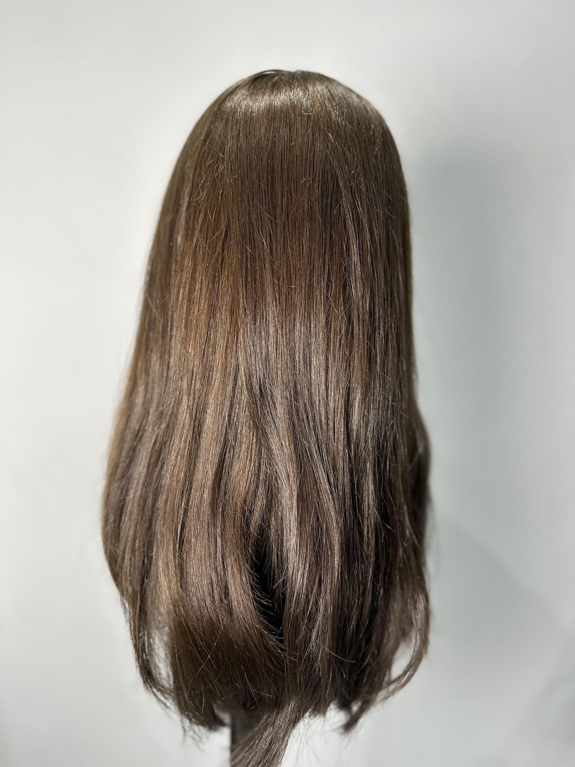 has a soft, medium brown color with natural highlights. The shade leans towards a warm brown with subtle, lighter tones that add depth and dimension to the hair. It has a rich, natural appearance with a smooth, silky texture.