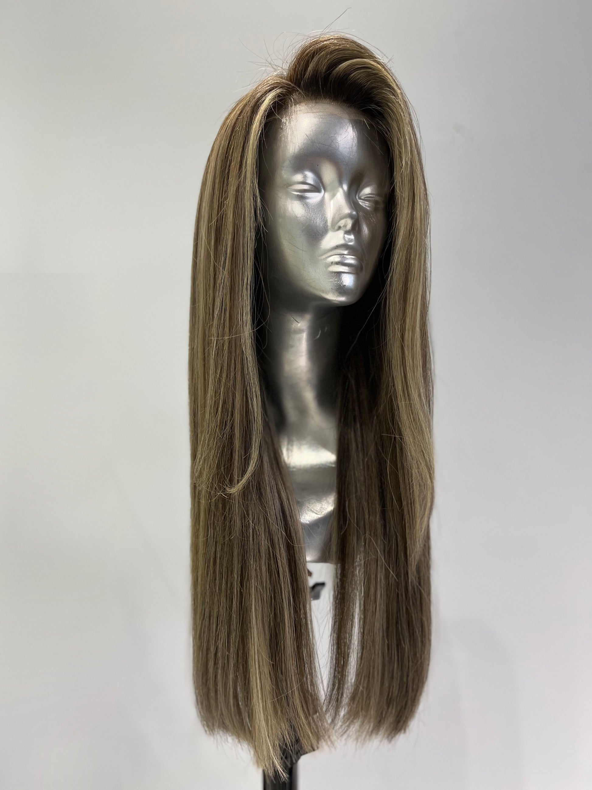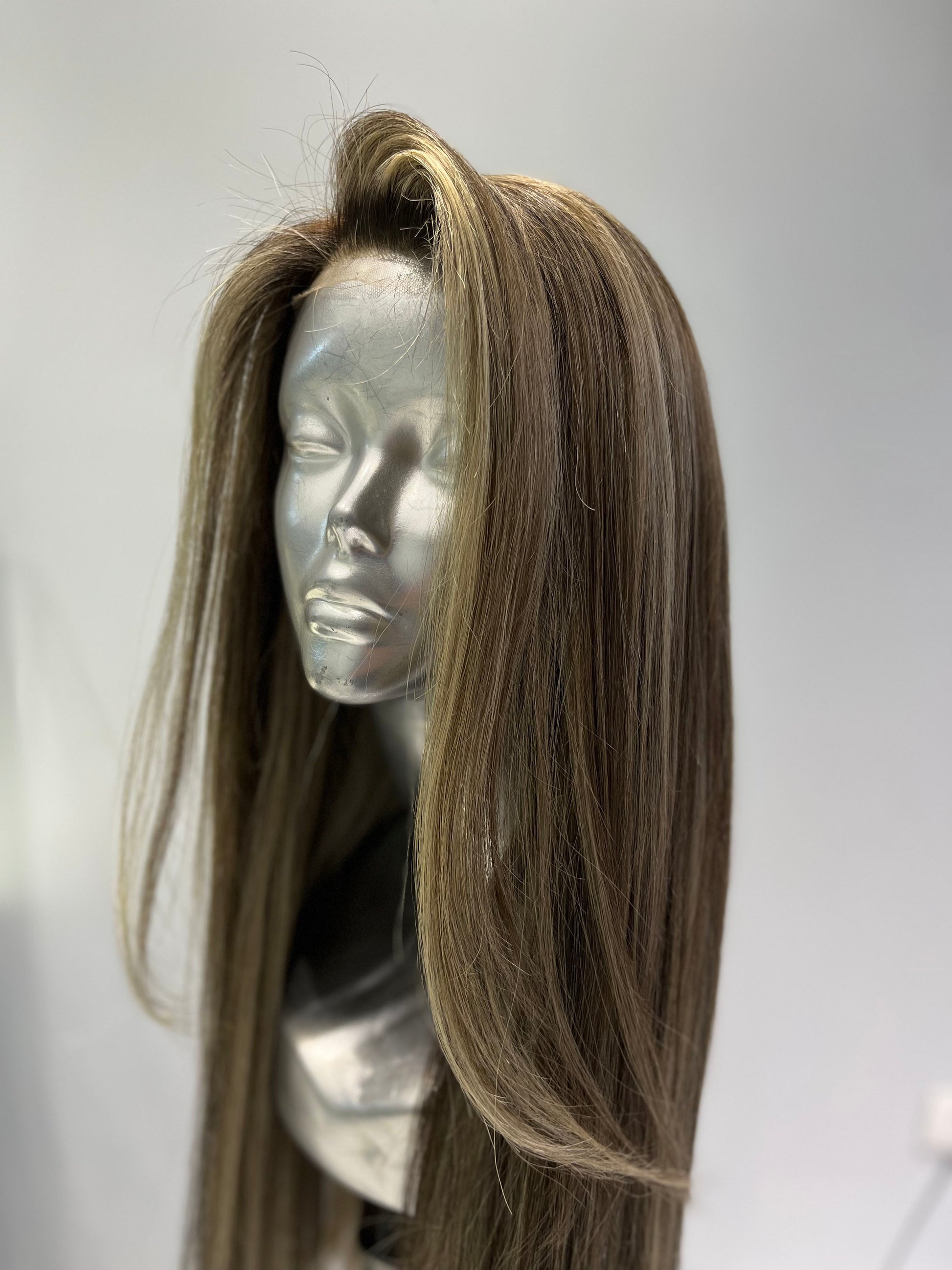 (Ash highlights) - Made with high-quality human hair. 26-inch length, 180% density, bleached knots, pre-plucked, baby hairs added.