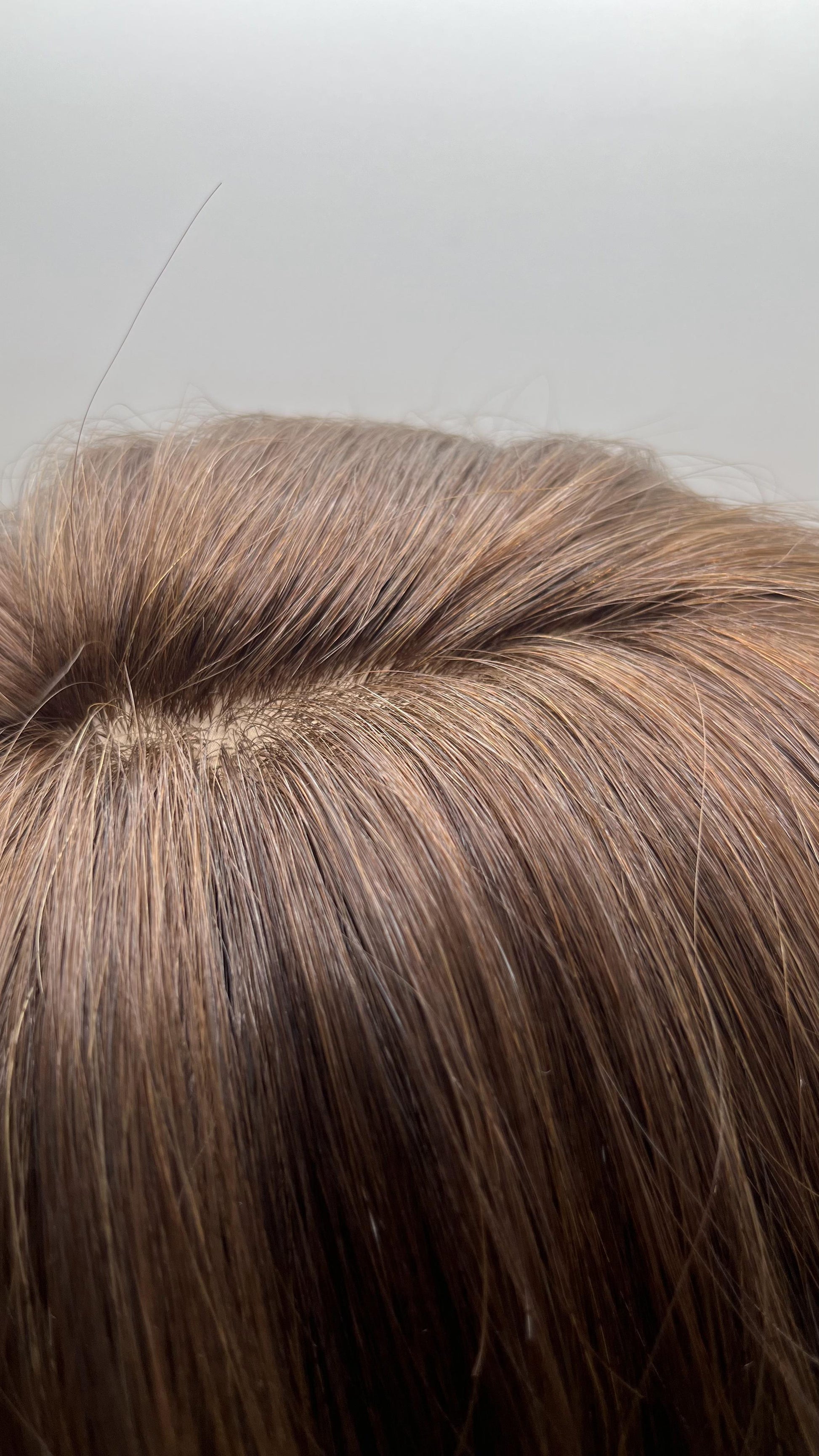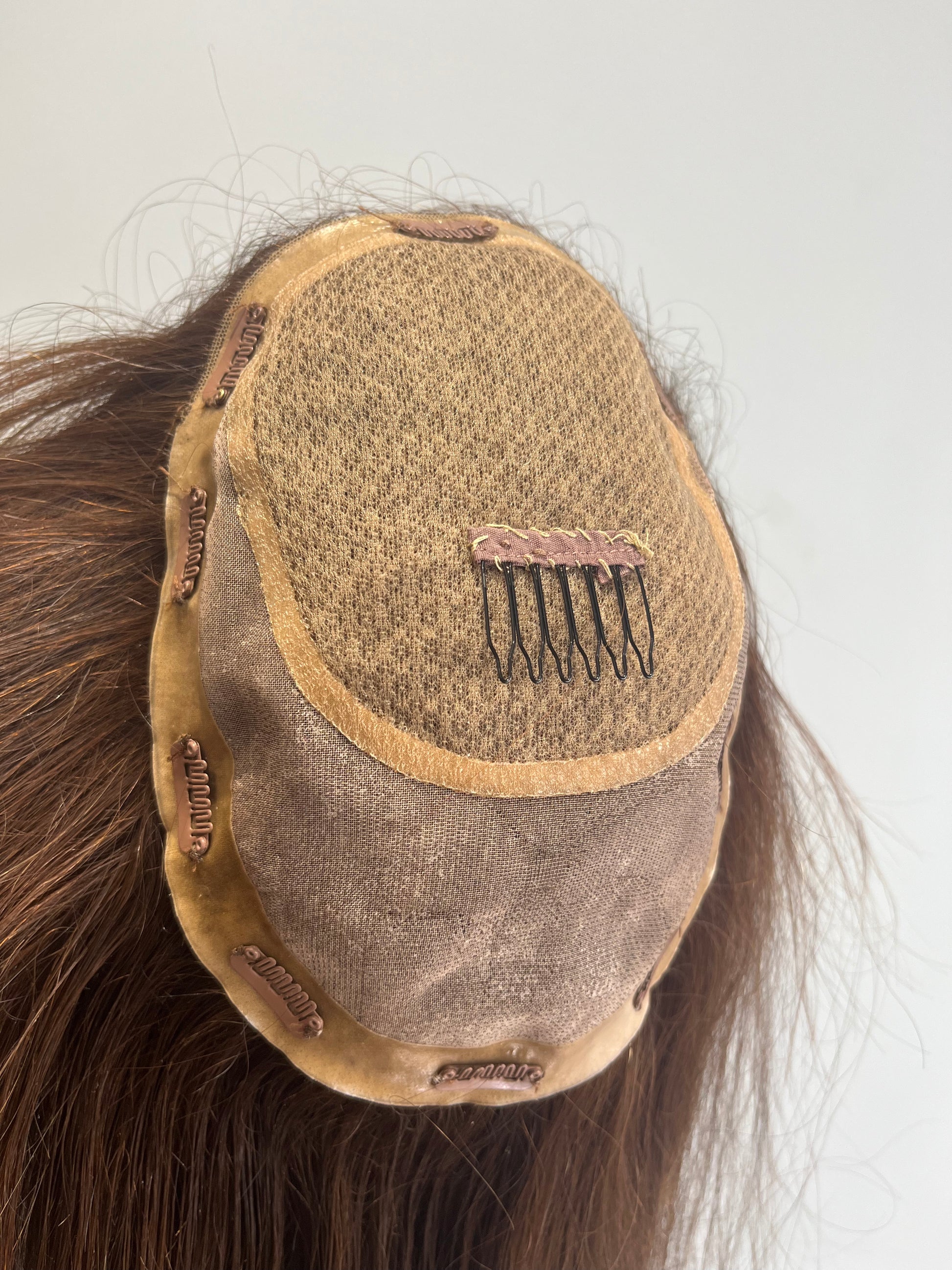 9x9 Inches Topper, silk base, PU-round, with 180% Density of 100% premium human hair.